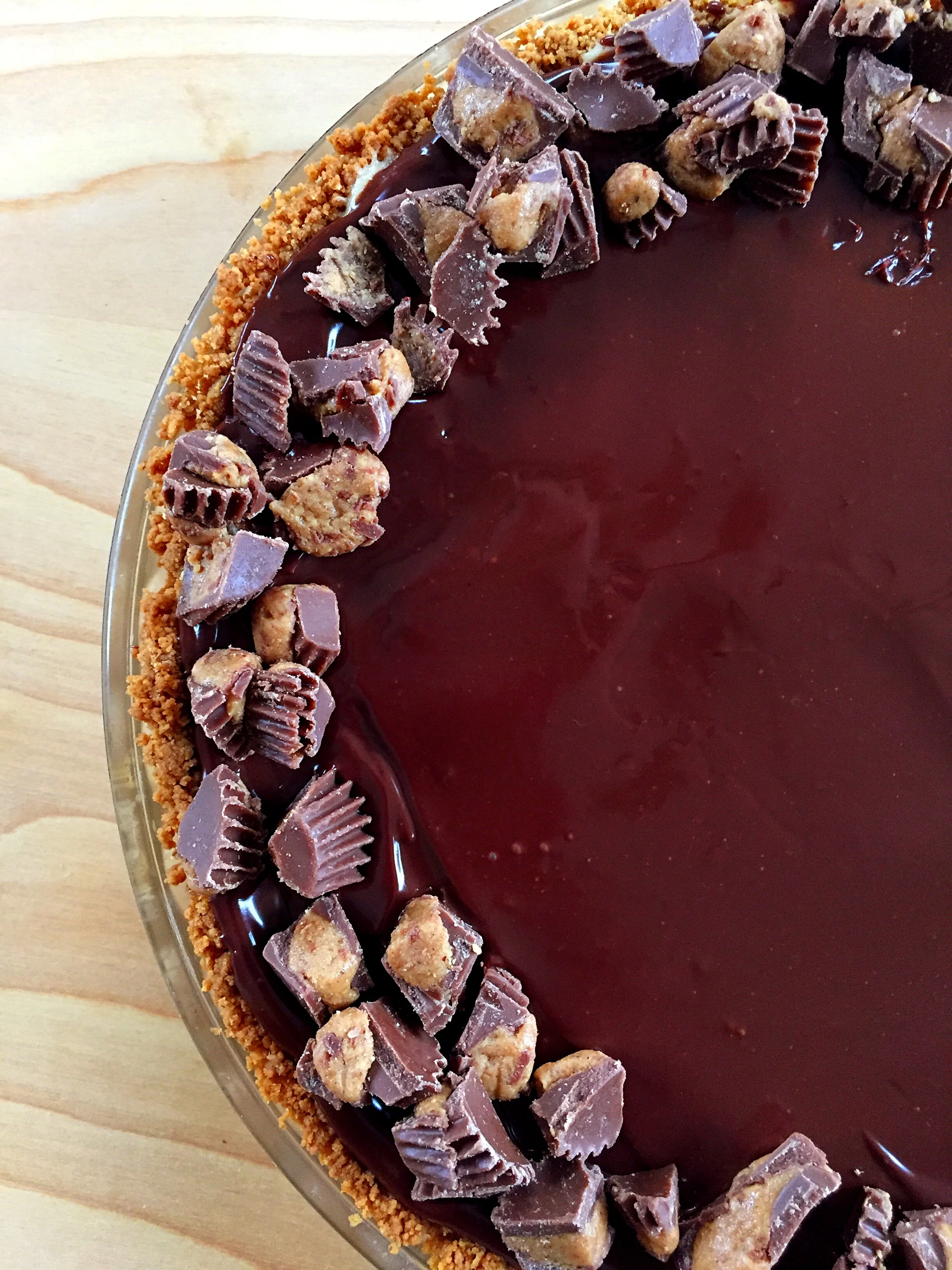 We start with a peanut butter cookie crust (Nutter Butters!) then top it with a dense peanut butter mousse and chocolate ganache. And in case that's not enough chocolate or peanut butter for you, the pie is finished with a sprinkle of chopped peanut butter cups. In one word: decadent.